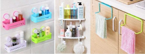 Из пластика есть недорогие, хоть и не очень элегантные корзинки, полочки, держатели
