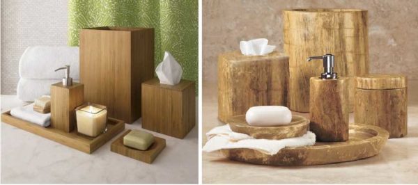 Деревянные аксессуары в ванной смотрятся очень необычно