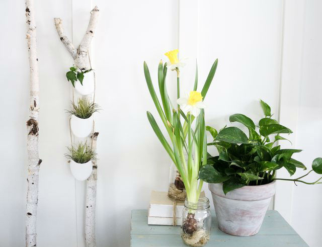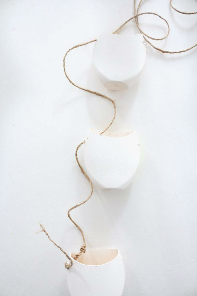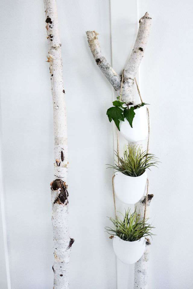 Далее по бокам кашпо создаем отверстия. Продеваем в первое боковое отверстие первого горшка шпагат, завязываем несколько плотных узлов, чтобы шпагат держался в отверстии, далее кончик шпагата продеваем в отверстие верхнего горшка – завязываем узел, затем в отверстие следующего горшка – завязываем узелок. Затем перекидываем нить на другую сторону и продеваем шпагат в противоположные отверстия, опять же не забываем завязывать узелки, чтобы горшки не скользили вниз по шнуру. Осталось высадить растения, и подвесить кашпо в нужном месте. Отличный дизайнерский ход – подвешивание на сухих спилах стволов березы!
