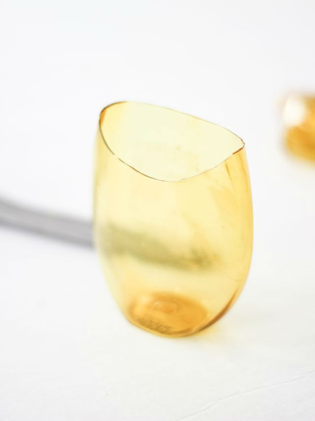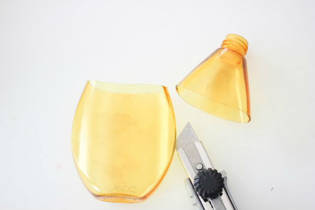 Удаляем этикетки с бутылочек. Нам понадобится нижняя часть бутылочки из-под шампуня, поэтому отрезаем верхушки при помощи канцелярского ножа, можно использовать ножницы. А переднюю часть бутылочки можно срезать ножницами полукругом, сформировав углубление.