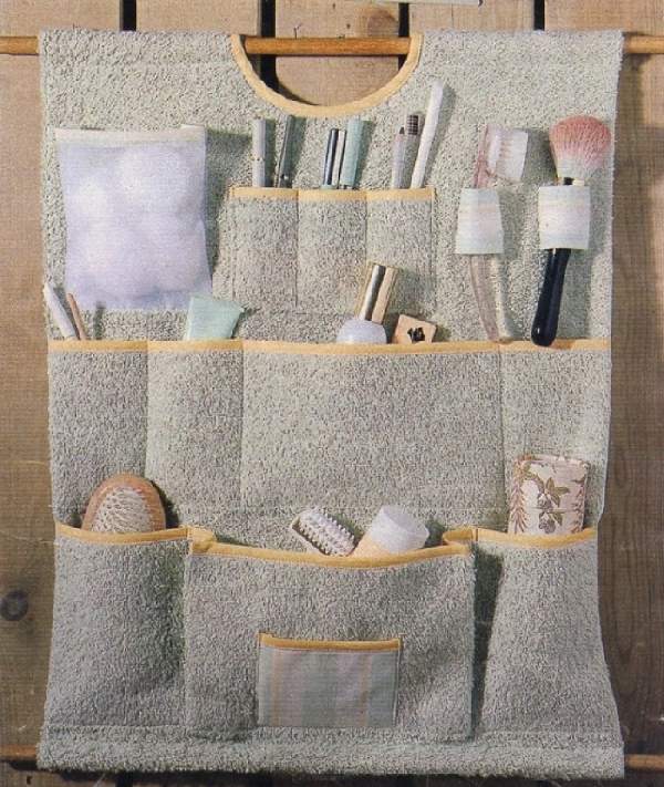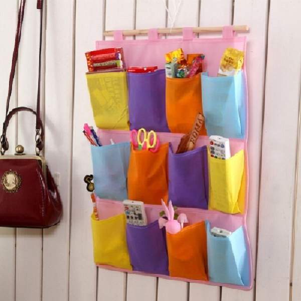 Подвесная полка из ткани своими руками делается довольно просто: на большой подготовленный отрез-основу пришиваются более маленькие, как карманчики. Размеры их зависят от личных предпочтений. Они могут быть однотонными или разных цветов, а также дополнены различными декоративными украшениями.