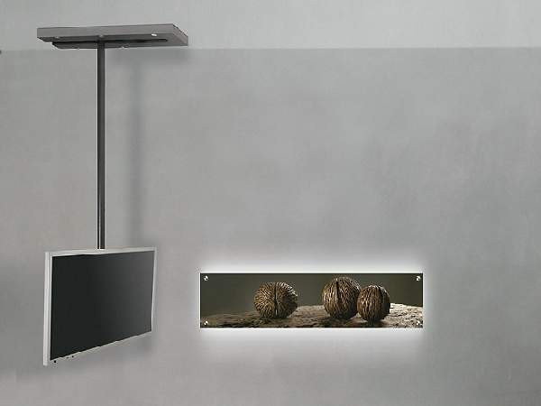 Хорошим вариантом станет подвесная полка под телевизор в детской комнате — тогда маленький ребенок не сможет до него дотянуться и, следовательно, «укоротить» срок его эксплуатации. В большинстве своем эти полки представлены настенными моделями, но есть особые конструкции с кронштейнами, например потолочная подвесная полка под ТВ. Она может быть зафиксирована на любом расстоянии и удобной высоте от места просмотра.