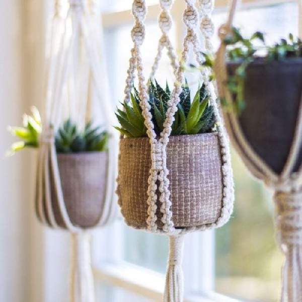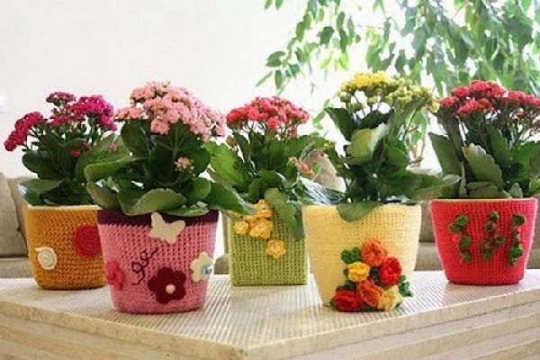 Для того, чтобы такая подвесная полка для цветов своими руками действительно была самой оригинальной, можно использовать вязку. Красивый цветной мешочек, с вазоном внутри, подвешенный к потолку, будет смотреться тепло и изящно, особенно, если его дополнить такими же «разноцветными соседями». Если же вязание не Ваш конек, можно прибегнуть к использованию плетеных корзинок, пластиковых ведер и горшков. С помощью клея-пистолета можно оклеить лицевую сторону будущих кашпо ракушками, мелкими камушками или бисером и соорудить веревочные подвесы.