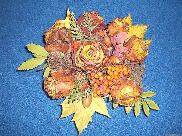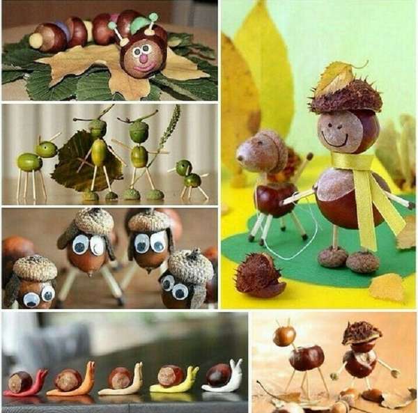 Деток постарше заинтересует осенняя поделка из природного материала своими руками в виде букета из кленовых листьев, обернувшихся розами с помощью несложных манипуляций. Оригинальных человечков, животных можно сформировать, используя каштаны, желуди. Маленьким умельцам дайте пластилин, чтобы скрепить детальки, а дети постарше могут воспользоваться шилом, проделывая дырочки для ножек, ручек.