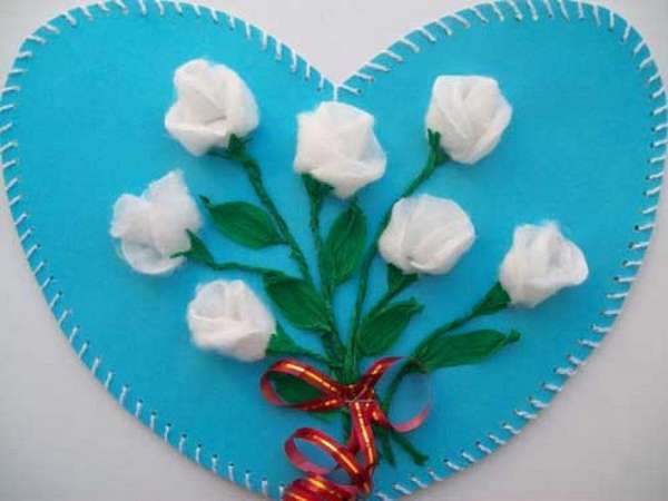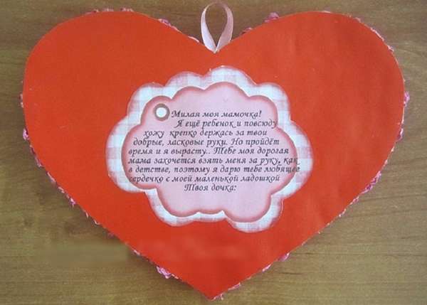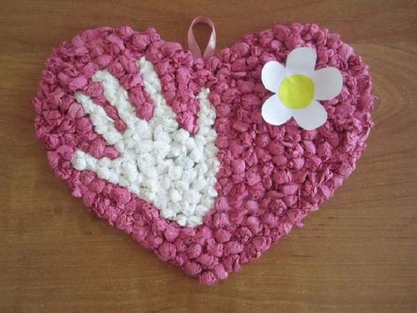 Маму наверняка порадует изящная открытка-сердечко с ладошкой ее ребенка. Чтобы ее оформить, нужно вырезать из картона заготовку-сердце, приклеить к ней петельку. Затем, из белых и красных салфеток скатываем маленькие шарики (они должны быть пушистыми). Ладонь ребенка нужно обвести на картоне, смазать клеем, плотно (без просветов) приклеить к ней белые комочки, а остальное пространство открытки оклеить красными. На обратной стороне можно оставить поздравления-пожелания.