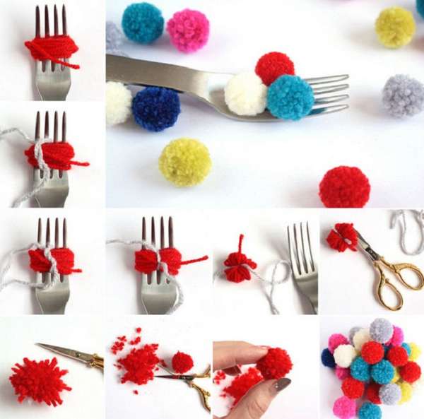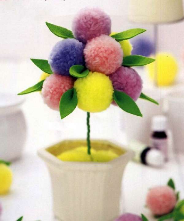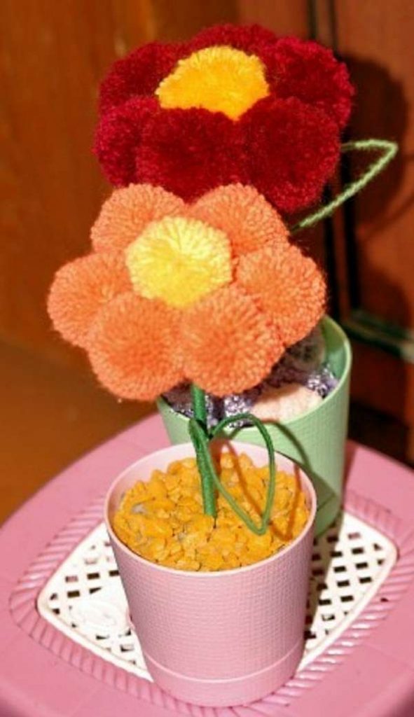 Научившись делать помпоны, согласно пошаговым инструкциям статьи, формируйте из них самые разные пышные и мягкие букетики. При этом нити для изготовления помпонов лучше выбрать шерстяные, чтобы они создавали более объемные шарики. Поделки из искусственных цветов своими руками часто формируются с помощью проволоки в виде стеблей, которую хорошо «замаскирует» обмотка зеленой нитью.