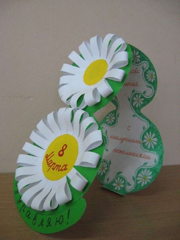 Помимо символичного праздника матери, есть еще пару дней в году, когда дети всячески стараются сделать для своих мам душевные поделки-подарки своими руками — это 8-е Марта, а также мамин День Рождения. Помимо различных искусственных или натуральных букетов, стоит оформить к Международному Женскому дню открыточку в виде восьмерки. Ее стоит сделать в нежных тонах, добавив бумажные цветы, поздравления.