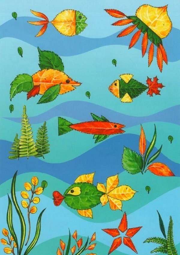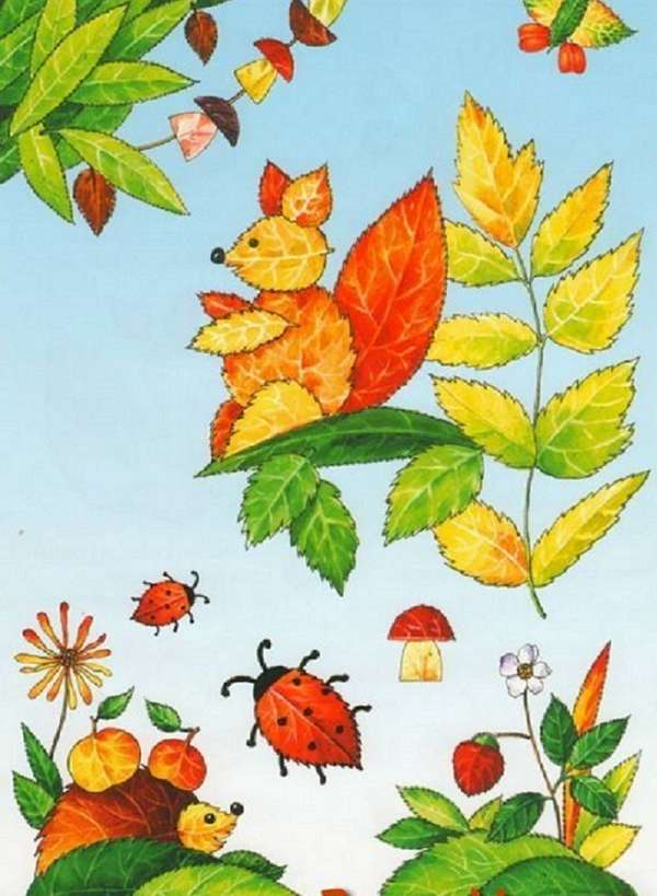 Если ребенок хочет сконструировать что-нибудь самостоятельно, без помощи взрослых, подскажите ему вариант с аппликацией. Картинки можно создавать, используя красивые осенние листья. Поделка из природного материала руками ребенка всегда будет отличаться индивидуальностью, так как дети не любят делать что-либо по шаблону. Забавные жучки, белочки, рыбки, ежики — это все под силу сделать даже самым маленьким.