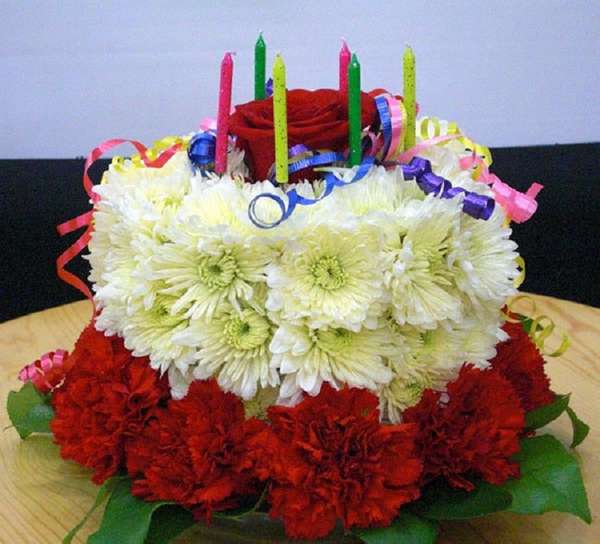 Поделки для мамы своими руками на День Рождения стоит сделать более символичными, например, как показано на фото, оригинальный тортик, украшенный живыми цветами. Те, кто не имеет возможности их достать, могут вырезать цветы из цветной бумаги. При этом основу стоит сделать из газеты: «скомкайте» листы, сформируйте форму, затем перевяжите нитью. Готовую конструкцию оклейте цветочками, рассаживая их плотно друг к дружке. Удачно увенчают такую композицию декоративные свечи.