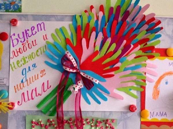 Нередко в детских учреждениях проводятся различные выставки, а, иногда, утренники к празднику мам. Различные поделки ко Дню матери своими руками дети делают под руководством воспитателей или самостоятельно. Например, очень трогательно смотрится букет детских ладошек или спадающие дождевые капельки, на каждой из которых размещена фотография ребенка.