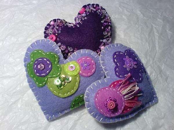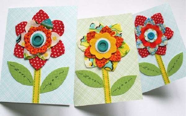 Есть более простые варианты, которые подойдут детям младшего школьного возраста — аппликационные поделки из материала своими руками с использованием кусочков фетра. Заменят эту ткань плотные посудомоечные салфетки. Из них вырезают цветочки, наклеивая затем на картон. Серединку оформляют пуговичкой.