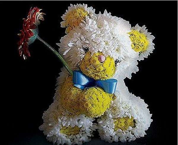Более сложный способ, но вполне доступный — сформировать игрушку. Тогда Вам понадобится «флористическая губка», формирующая основу, проволочки или шпажки для скрепления деталей. Из губки нужно вырезать части тела, смочить, дать стечь воде. Проволочкой скрепляем между собой. Чтобы поделки из цветов своими руками сохранились как можно дольше, срезайте бутоны цветов наискосок. Затем плотно, без просветов, вставляем цветы. Глазки, носик, рот делаются из картона.