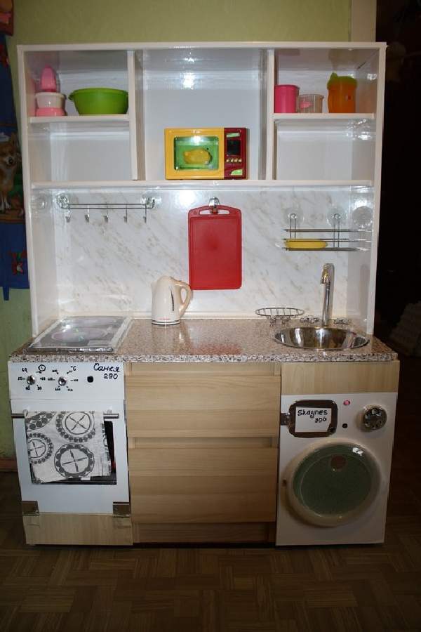 Ещё одна отличная идея для поделок из картона — это игрушечная кухня для дочки. Если у вас лежит без дела парочка прямоугольных коробок из-под бытовых приборов, то из них вы можете сделать оригинальную кухонную плиту или холодильник.