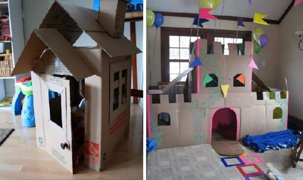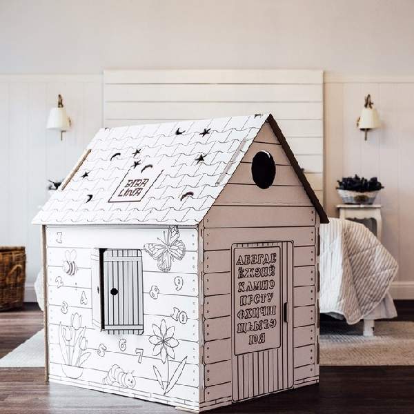 Практически все маленькие дети любят делать из подушек и одеял «халабуды», чтобы спрятаться от взрослых и заниматься в уединении своими делами. Если у вас есть большая коробка из-под холодильника или кухонной плиты, то вы можете сделать из нее красивый и уютный детский домик.
