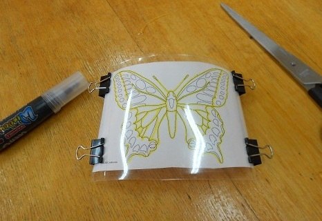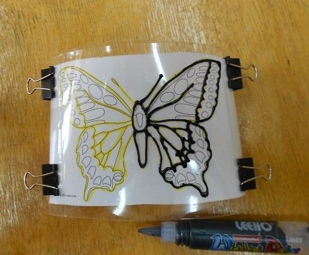 Шаг 2. Рисуем на бумаге бабочку и с помощью зажимов прикрепляем рисунок к пластиковой основе.