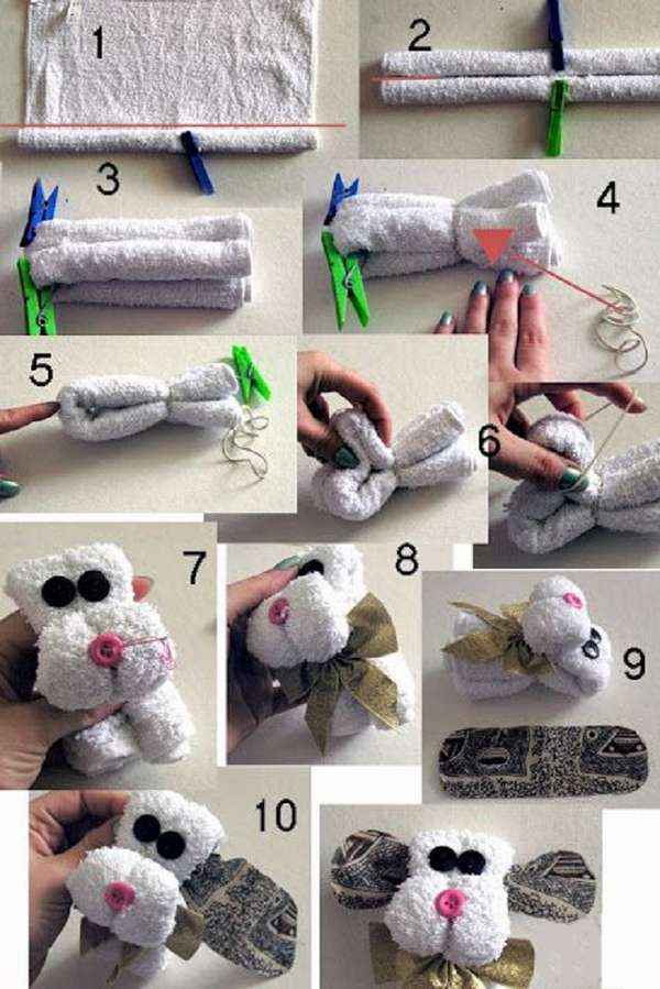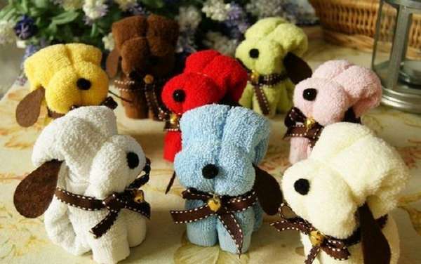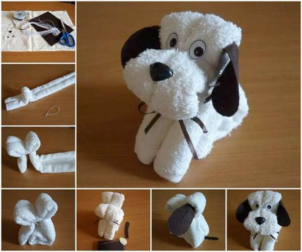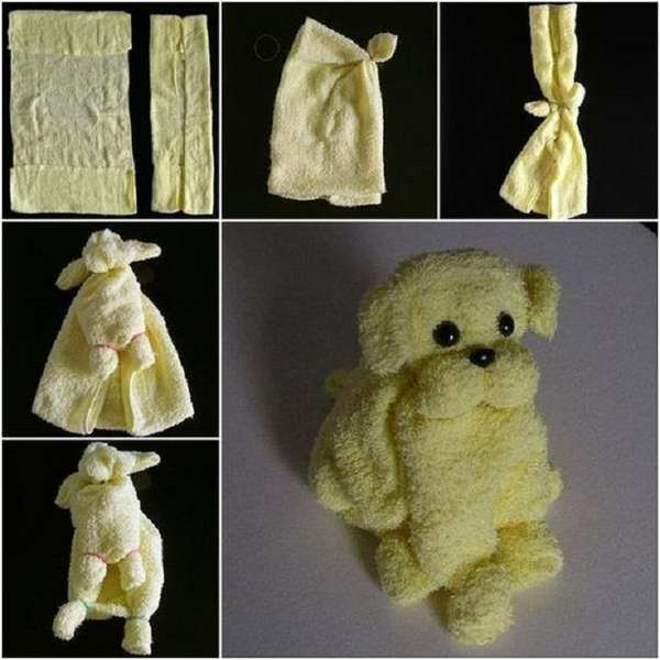 Приняв решение накануне торжества обновить домашний текстиль, не спешите избавляться от старых полотенец, из них могут получится симпатичные поделки на новый год своими руками, например, символичный песик. Схемы складывания Вы найдете ниже в статье. Лучше использовать в работе прищепки для фиксации формы на протяжении формирования, а изгибы затягиваем резинками. Когда фигурка готова, останется лишь пришить ушки, глазки и носик. Поскольку символ года — желтая собака, поделки своими руками стоит формировать соответствующего цвета. Кстати, полотенца лучше брать махровые, не толстые.