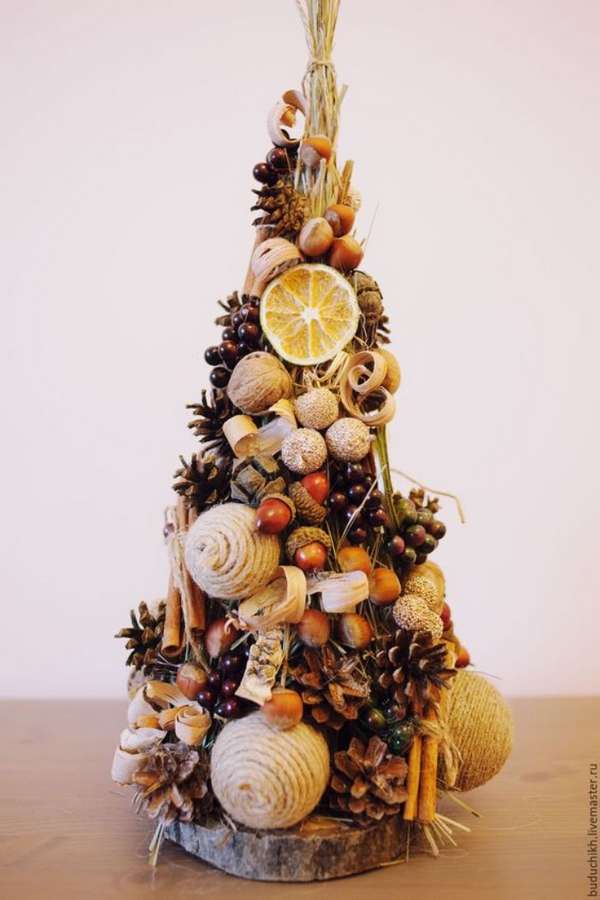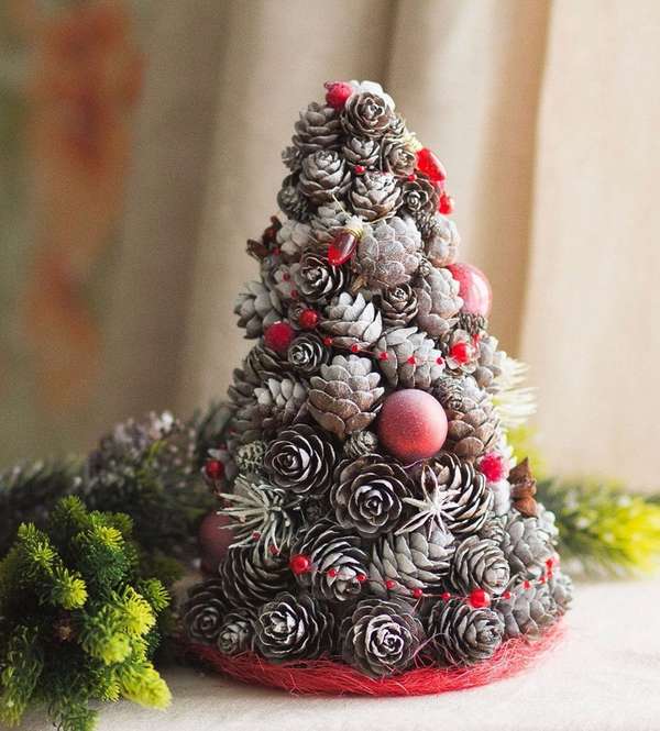 Насобирайте в лесу самых обычных шишек разных размеров — от больших до маленьких, рассортируйте. Для красоты, их можно окрасить акриловыми красками или вскрыть лаком с блестками и дать хорошенько просохнуть. Затем шишками оклеивается картонный подготовленный конус — у основания большие, а дальше все меньше и меньше. Украсить елочку стоит, как и другие поделки к Новому Году 2018 своими руками: бусами, мишурой, искусственным снегом и т. д.