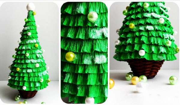 Изготовить «зеленую красавицу» проще всего из картона и двухсторонней зеленой бумаги. Возьмите лист А1 формата и сформируйте из него конус нужной величины. Края лучше зафиксировать степлером. Нижнюю часть подрезаем ножницами, чтобы конус ровно стоял. Зеленую бумагу режем на полоски, которые, с помощью надрезов, превращаем в бахрому, и по кругу оклеиваем ею нашу основу (можно использовать гофробумагу). Когда елка своими руками поделка готова, бахрому необходимо завить, используя ребро ножниц. Игрушки можно просто пришить, наклеить бумажные снежинки и обернуть всю конструкцию мишурой.