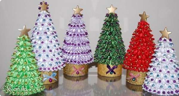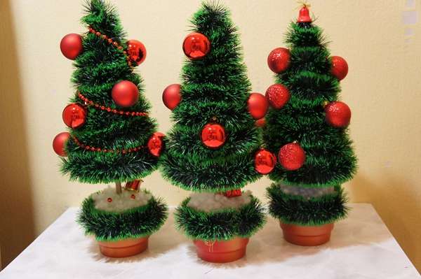 Можно сделать чудесную елочку для сладкоежек из конфет. Для этого не стоит приобретать дорогостоящие сладости — подойдут самые обычные леденцы. Для работы понадобятся также ножницы, скотч, заготовка — конус, мишура и, собственно, конфетки. На фото в статье пошагово продемонстрирован весь процесс, как мастерится елка своими руками. Поделка состоит из поочередных рядов конфет, приклеенных скотчем и мишуры. По окончании праздников, она станет завершающим подарком для Вашего чада.