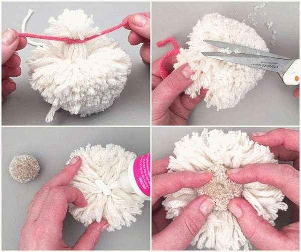 Замечательные собачки, изготовленные из нитяных помпонов, наверняка позабавят детишек и займут центральное место композиции под новогодней елкой. Такая поделка своими руками на 2018 делается очень просто. Необходимы два мотка нитей (лучше взять шерсть) — белый и кремовый и немного фетровой ткани. Делаем два белых помпона побольше и один мелкий из кремовой нити (мордочка). Ножницами немного стрижем их, а затем клеим мордашку. Соединяем туловище с головой. Из украшений используются фетровый шарфик-ошейник, бантик, медальончик и т. д.