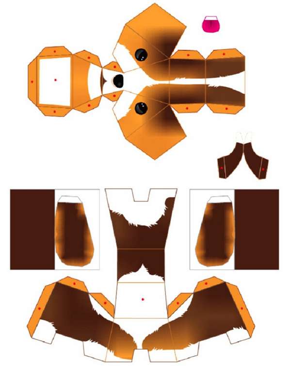 Наступающий год Собаки 2018, поэтому мастерим поделки своими руками в виде песиков, будочек, косточек. Возможно, это будут простые аппликации или же объемные фигурки. Используют готовые шаблоны, из которых вырезают заготовки, сгибают в указанных местах и склеивают стыки. Далее мы представим на фото некоторые готовые схемы. Чтобы сделать будку, используйте старую коробку или же сформируйте ее из любого картона, согласно шаблонам. Обязательно украсьте поделки своими руками на новый 2018 год всякими блесточками, мишурой, крышу будочки оклейте тонким слоем ваты, имитируя снег. Из плотных листов вырежьте разнообразные косточки, и, нанизав их на нить, развесьте гирлянду на елке.