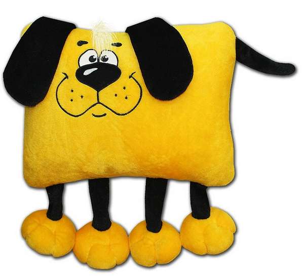 Для формирования подушки не нужны специальные шаблоны — все делаем по своему усмотрению. На изнаночную сторону желтой ткани наносится квадрат (туловище) любой величины и шаблоны нижних частей лапок, а из черного материала формируем хвост, верхние части ножек и уши. Набиваем рисом саму подушку с нижними лапками. Глазки с носом вырезаем из простой ткани и приклеиваем, бровки вместе с мордочкой вышиваем. Отличная позитивная поделка собака-подушка своими руками готова. Если не полениться, можно изготовить несколько таких песиков, которые будут впоследствии украшать мягкую мебель интерьера.