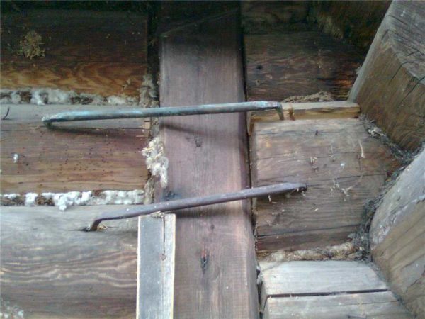 Такие скобы надо установить внизу, скрепив несколько нижних венцов, или в месте крепления пристроек, если они поднимаются вместе с домом
