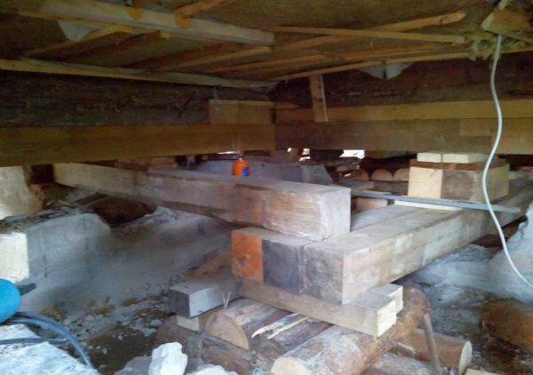 Вторая частая причина, по которой требуется поднять деревянный дом — сгнили первые венцы сруба. Результат тот же: дом оседает и чем дальше, тем больше. Гниль ведь продолжает распространяться. Потому сруб поднимают, после чего удаляют старые сгнившие венцы, заменяя их новыми. По-другому ремонт сруба провести не удается.