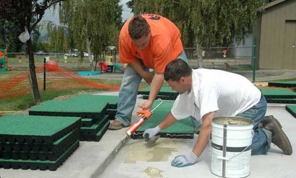 Также резиновое покрытие для детских площадок в виде плитки можно класть на бетонную стяжку. В этом случае обязательно нужен полиуретановый клей. Расход — 1-2 кг на квадратный метр.
