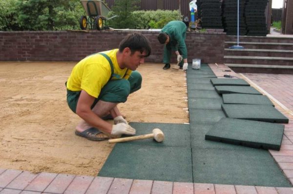 Резиновое покрытие для детских площадок: укладка плитки из резиновой крошки на песчаное основание похожа на укладку тротуарной плитки