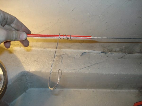 • Из проволоки сгибаем крюк, который крепим на трос. К тросу приложить карандаш, вокруг него обмотать свободный конец проволоки от крюка. Карандаш вынуть. Все, крюк закреплен на тросе. На этот крючок удобно вешать излишки провода.