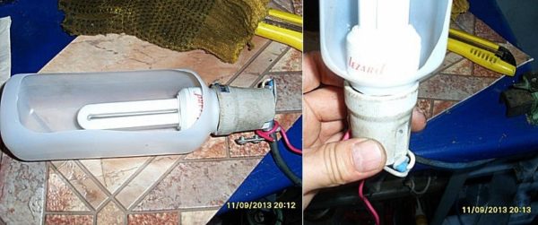 Основная задача — найти пластиковый сосуд со стенками из полупрозрачного молочного пластика средней толщины. Прозрачный не пойдет — не будет рассеивать свет, слишком тонкие стенки не спасут от ударов лампу. После того как нашли подходящий сосуд остается мелочь: