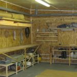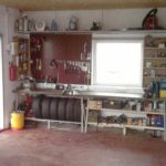 • Вдоль одной из длинных стен. Такое расположение выбирают, если гараж широкий, но недостаточно длинный. Имеет смысл расположить стол и верстак слева от входа — со стороны водительского места. Но это некритично. Недостаток такого расположения рабочего места в гараже — двигаться приходится с некоторой опаской, зато удобнее вносить/выносить инструменты на улицу.