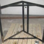 Ширина полки — 4-х кратная ширина шины, плюс запас 10-15 см на некоторую свободу. Высота задней стенки — чуть выше наружного диаметра колеса. Конструкция проста = сбоку напоминает прямоугольный треугольник. Имея инверторный сварочный аппарат, сварить такую полку не представит труда.