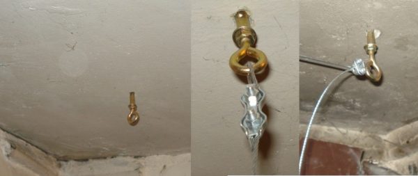 • На потолке с одной и с другой стороны на расстоянии 30-50 см от угла сверлим отверстие в перекрытии, вкручиваем анкера.