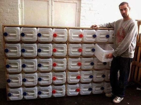 Есть, кстати полезная идея — сделать стеллаж для хранения инструмента из б/у канистр. Находите такие, у которых ручка расположена сверху. Далее все просто — вырезается одна из боковин и в дальнейшем эта канистра используется как ящик.