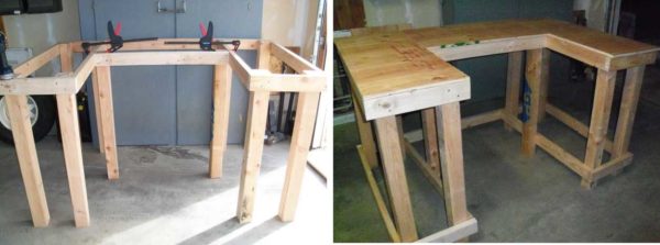 Стол или верстак для гаража делают из досок, обшивают фанерой. Недорого, вполне надежно. Если есть сварочный аппарат и навыки сверки, можно сварить раму из уголка или профилированной трубы. Обшить снова-таки лучше влагостойкой фанерой. Получается ровная стойкая к истиранию поверхность. Можно, конечно, использовать и ламинированный ДСП, но ламинирующий слой быстро повреждается.