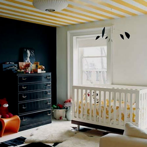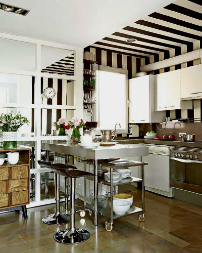 Полосатым может быть натяжной потолок, прибитые черно-белые рейки или полосатые черно-белые потолочные обои. В случае расположения полос на потолке будьте готовы к тому, что потолок будет визуально казаться ниже, словно нависая над головой, такой эффект получается из-за пестроты оттеночной палитры чередующихся полос.