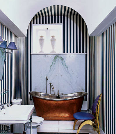 В ванной комнате стены можно покрыть полосатой плиткой, ну а в остальных комнатах дома стены оклеить полосатыми обоями. Вертикально расположенная полоска будет увеличивать уровень потолка, горизонтальная будет расширять стены помещения. Взяв за основу расположение полос на стенах, от прочих объемных полосатых предметов в помещении лучше отказаться.