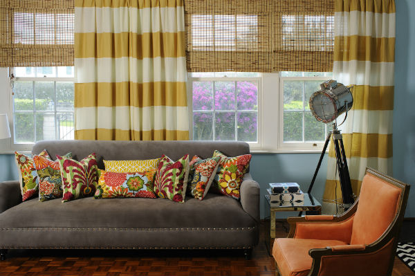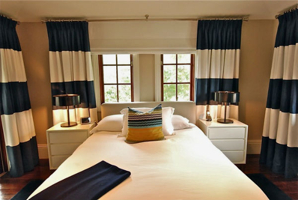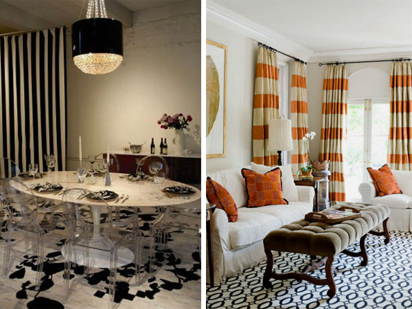 Полосатые шторы в моде были всегда, они могут вписаться в интерьер спальни, кухни, столовой, гостиной и ванной комнаты, то есть, по сути, могут использоваться повсеместно. Чтобы шторы гармонично вписались в тот или иной интерьер, необходимо, чтобы в помещении встречались детали, выполненные в одном из цветов шторных полос. К примеру, бело-оранжевые шторы в гостиной комнате могут сочетаться с оранжевым напольным ковром и оранжевыми декоративными диванными подушками.