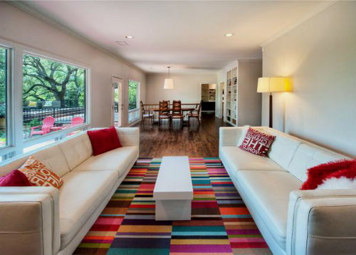 Очень красиво, свежо и интересно смотрится напольный полосатый ковер, выбор оттенка полоски должен исходить из общего стиля оформления посещения, к примеру, с серым диваном отлично будет смотреться серый ковер в яркую оранжевую полоску. Ну а к чисто белому интерьеру идеально подойдет черно-белый ковер, кстати, полоска не обязательно должна быть ровной, она вполне может быть плавающей, зигзагообразной, прерывистой и т.д.