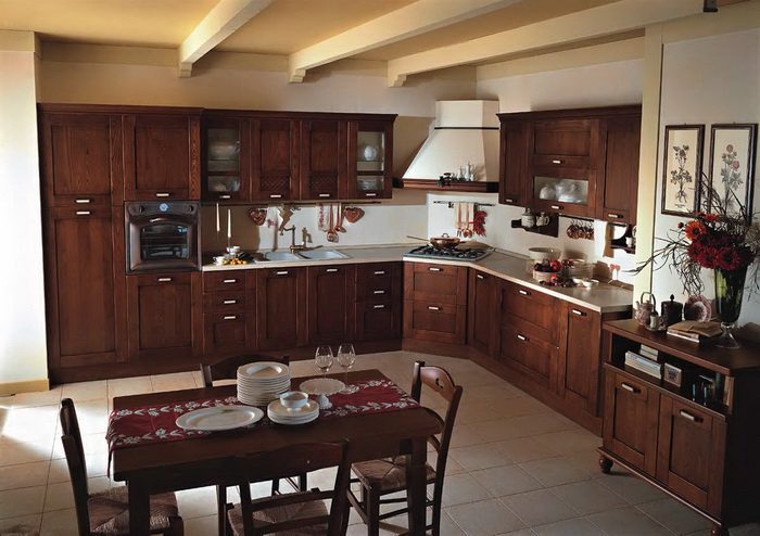 Потолки в деревенском или кантри стиле тоже обязательно декорируют балками. Очень трудно представить высокий и гладкий потолок в сельском доме. Обычно его пересекают несущие балки, а сам потолок набран из досок. Выглядят они (балки) серьёзно и внушительно. Это могут быть и ошкуренные топором брёвна и также, сделанный с помощью топора, брус.