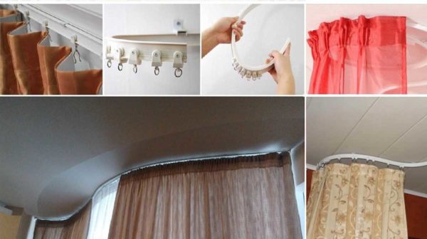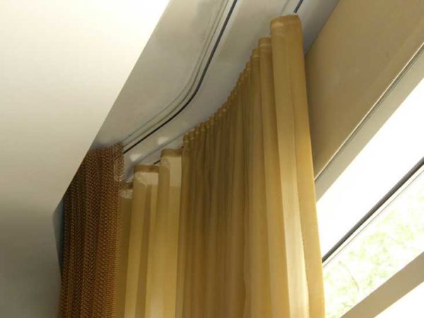 • Легко реализуются изогнутые линии. Для этого есть либо специальные гибкие потолочные карнизы, которым можно придать любую форму, либо сборные, в которых закругления имеют определенный радиус. Они вставляются в нужном месте при помощи встроенного замка, который не мешает передвигать бегунки (во всяком случае, не слишком мешает).