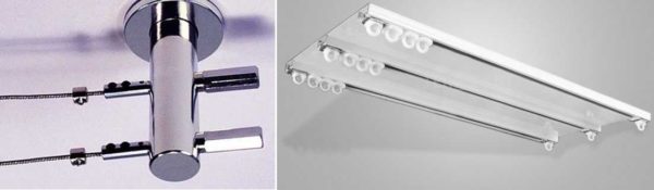 Конструкция струнных проста и незамысловата. Есть два крепления, длинный тонкий стальной (реже нейлоновый) шнур, по которому скользят крючки. Количество струн от одной до трех. Эти варианты хороши для интерьеров в минималистическом стиле. Также их используют, если карниз виден не будет: в нишах гипсокартонных или натяжных потолков, за декоративными накладками. Также это наиболее дешевый и в то же время функциональный вариант.