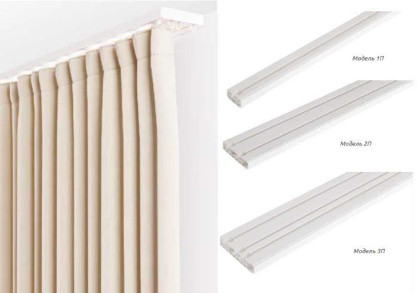 По количеству полозьев, по которым могут двигаться шторы, потолочные карнизы бывают однорядными, двухрядными, трехрядными. Вообще-то, можно найти конструкцию и с семью полозьями — для сложных конструкций, но перечисленные наиболее распространенные.