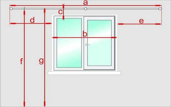 • Если окно большое, света в комнате более чем достаточно, можно карниз брать минимальной длины: ширина оконного проема + 40 см (по 20 см с каждой стороны). В этом случае открытые шторы будут немного перекрывать окно.