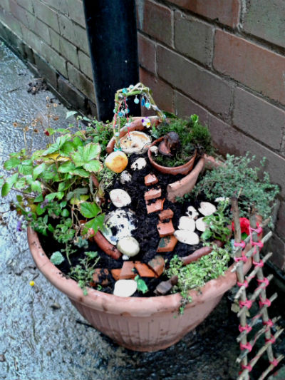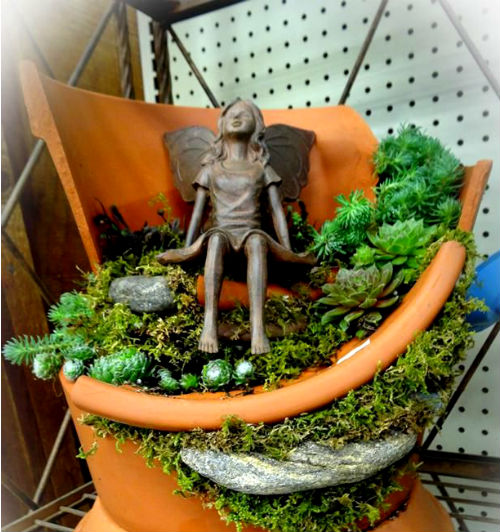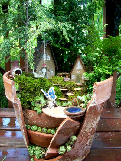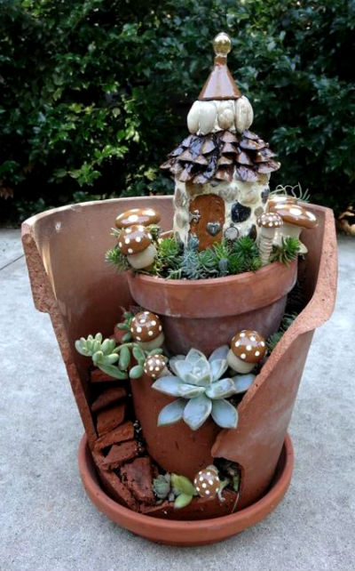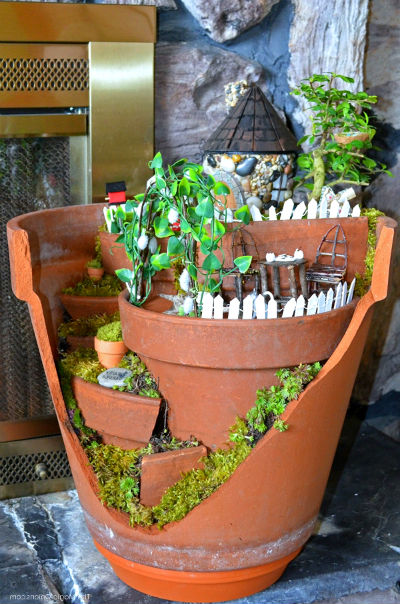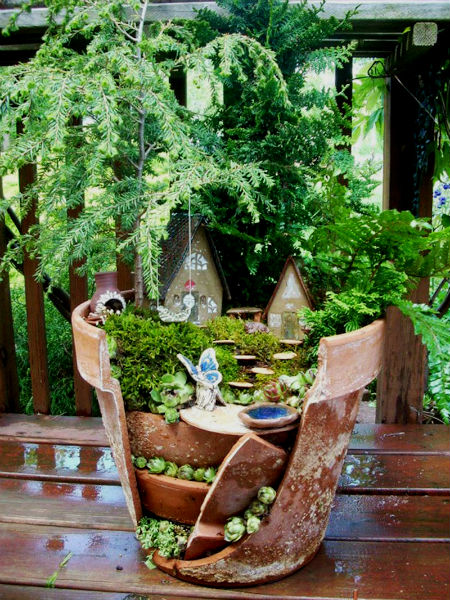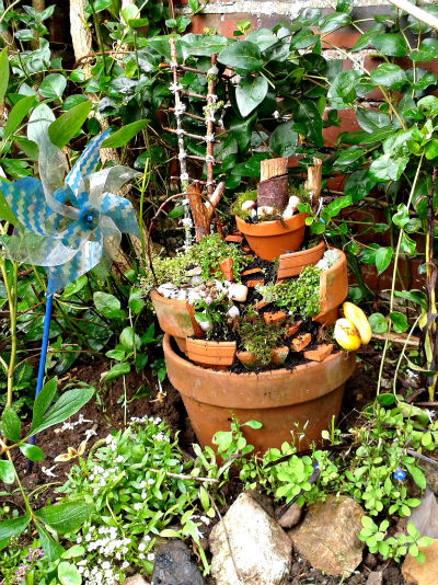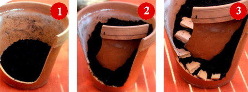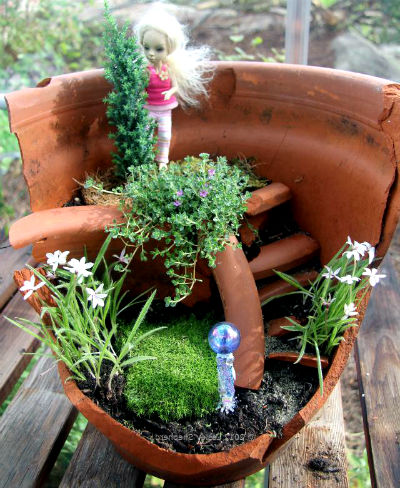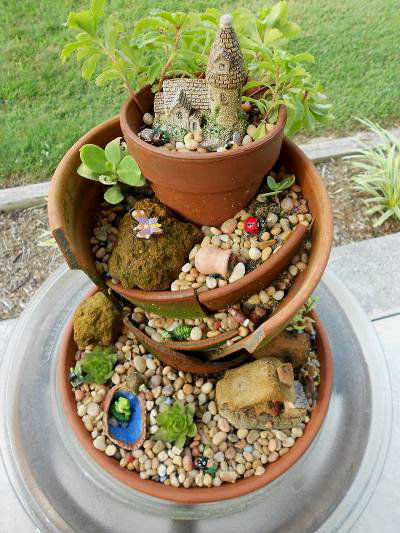 Для создания такой композиции понадобится четыре разных по размеру глиняных горшка. В самый крупный горшок всыпаем камни для дренажа, а также подготовленную землю и вермут, берем следующий по размеру горшок и молотком обиваем от него одну из стенок, получившийся горшочек прикапываем в землю, от следующего горшка также отбиваем часть стенки, и закапываем его в предыдущий горшок, а уже в него прикапываем одну из отбитых стенок, а также самую маленькую глиняную емкость. Оставшуюся стенку дробим на небольшие плитки, из которых выкладываем ступеньки. Осталось только высадить подходящие растения, и любоваться великолепным результатом.