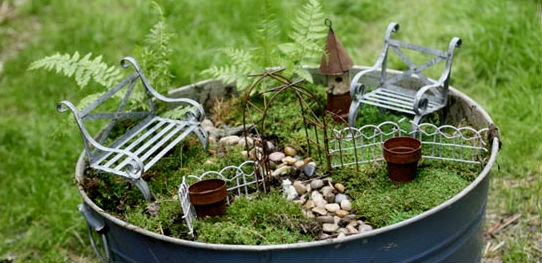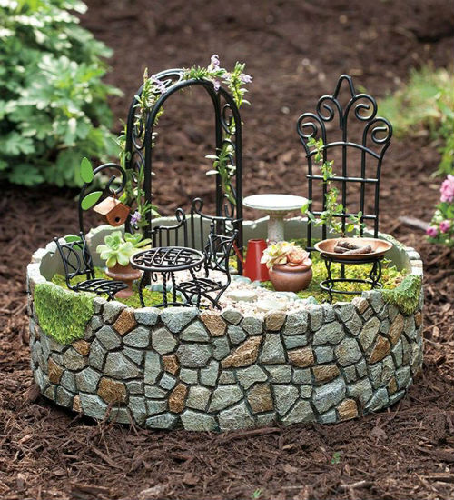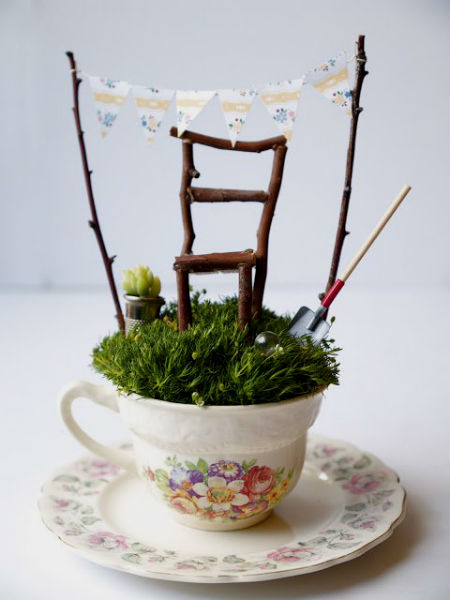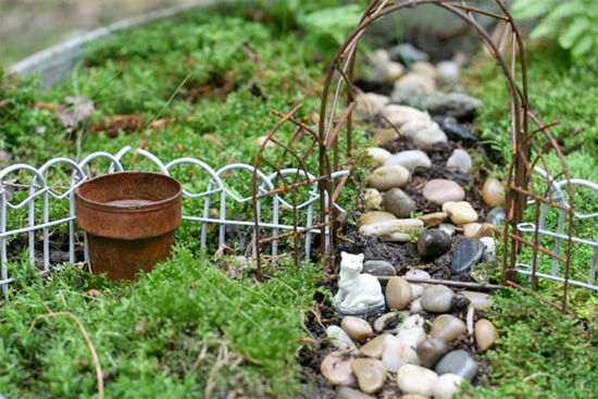 В миниатюре данный стиль смотрится еще более мило и привлекательно. Сюда подойдут белые лавочки по типу ковки (созданные из металлической проволоки), садовые арки, а также столик с кружками и чайником из полимерной глины. Подходящие растения представлены в общем списке ниже.