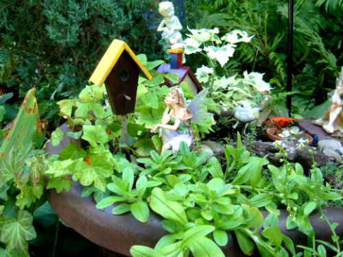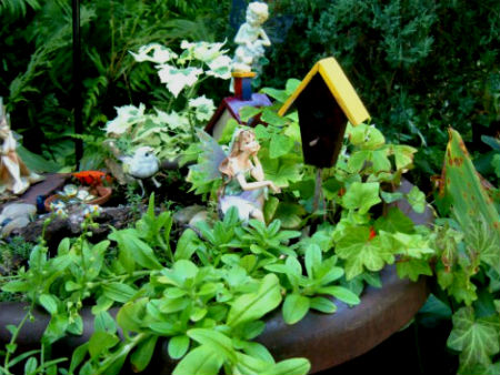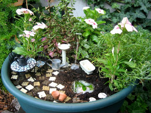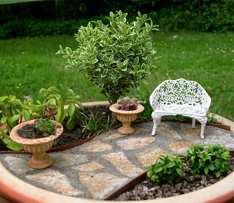 Для создания такого сада необходимо подготовить маленькую деревянную лавочку темного цвета, покрытую лаком, садовую арку (можно сделать проволоки), лаковую плитку, распиленную на мелкие плиточки, из полимерной глины вылепить фонтан (выглядит как чаша на ножке). Растения подбираем из общего списка, который будет представлен ниже.