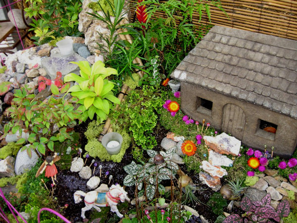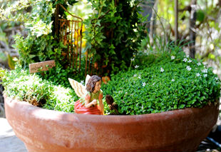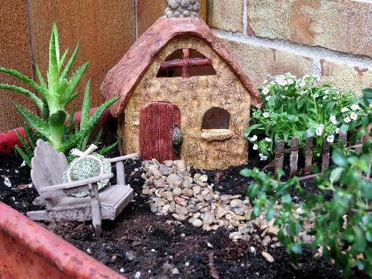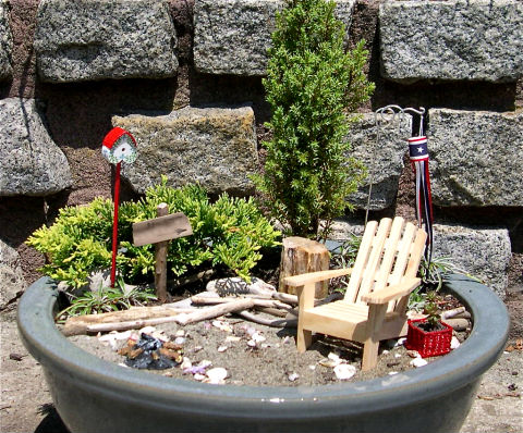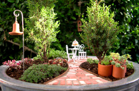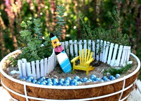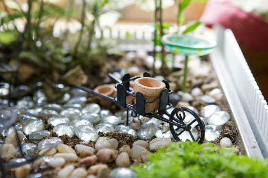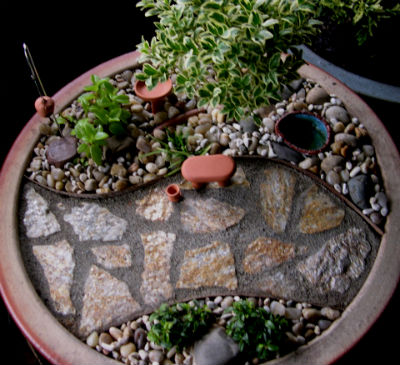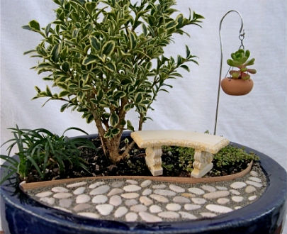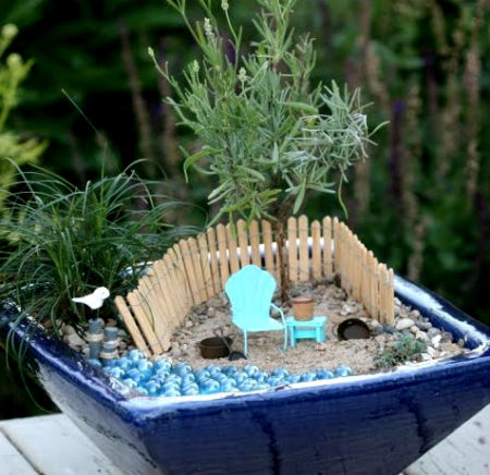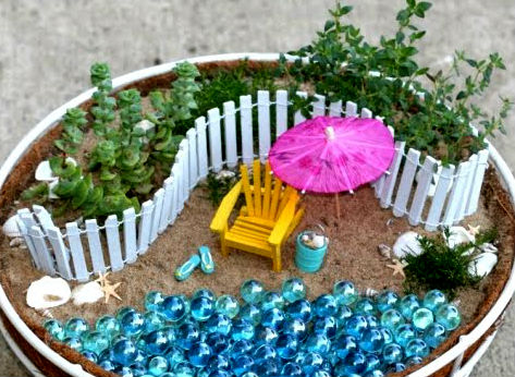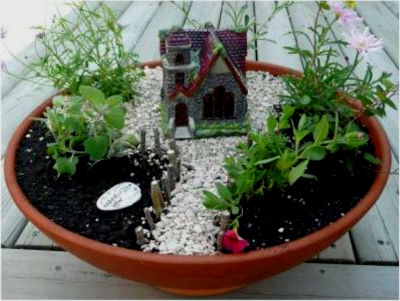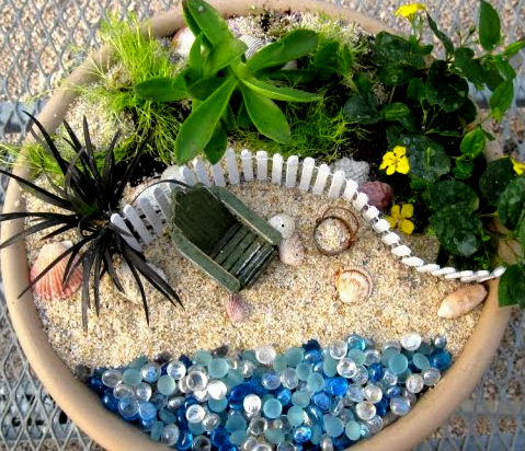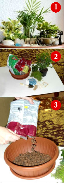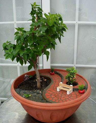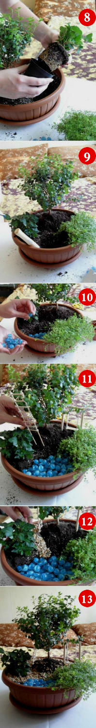 В вазон необходимо насыпать мелкую гальку или керамзит (камни будут играть роль дренажа). Затем всыпать землю, и добавить вермикулит (обеспечит дополнительную рыхлость почвы). Высаживаем ветвистые растения, имитирующие деревья. Из горшков растения следует доставать аккуратно, чтобы не повредить их корневую систему. Садовой лопаткой с заостренным концом выкапываем в вазоне ямки и высаживаем в них растения. Берем голубые стеклянные шарики (декоративный грунт) и выкладываем ими импровизированный прудик. Затем устанавливаем лесенку из шпажек, а также крошечные качели из веточек и цепочки. Выкладываем дорожку светлыми дроблеными камнями. Этими же камнями аккуратно заполняем пробелы вазона, везде, где виднеется почва. В результате получается интересный вазон с замечательными крошечными элементами.